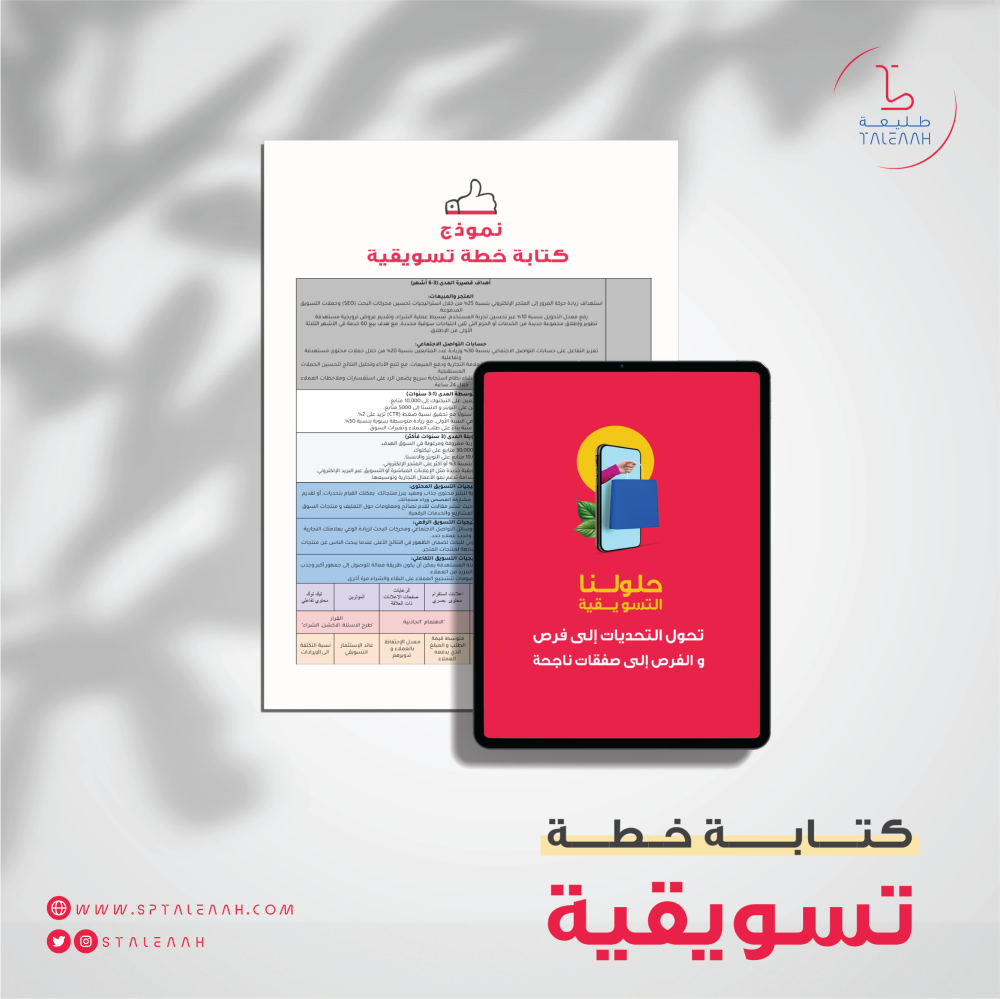 في استوديو طليعة، نقدم خدمة كتابة خطة تسويقية شاملة تساعد على توجيه جهودكم لتحقيق أهدافكم وزيادة أرباح مشروعكم. تتضمن الخطة:تشمل خدمة كتابة خطة تسويقي...